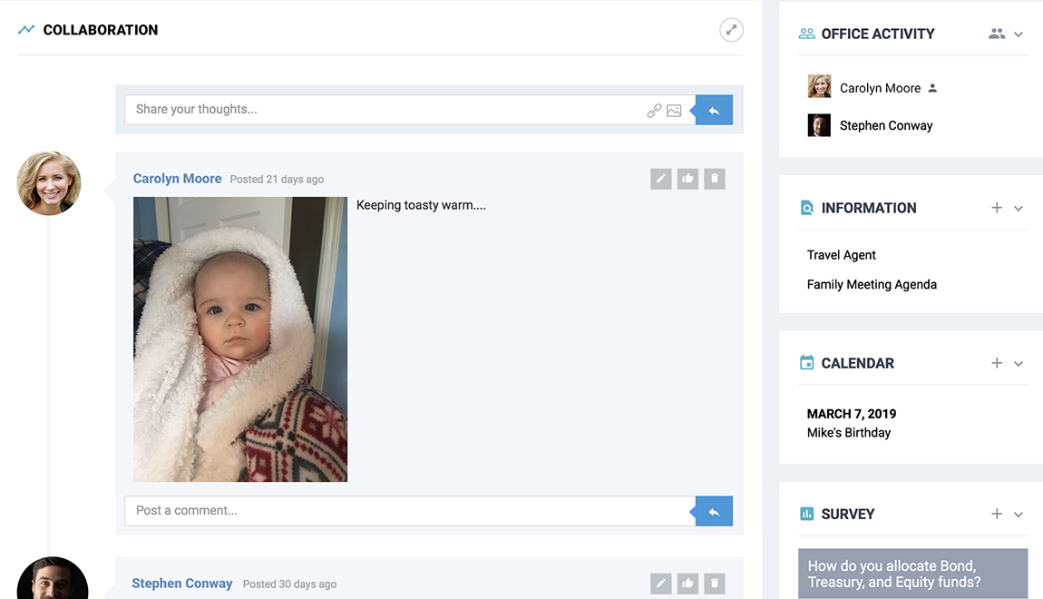 Create private social networking for members to post thoughts, photos, videos, and links. The “Wall” is a family favorite but can also be used by firms to exchange ideas and recent news.