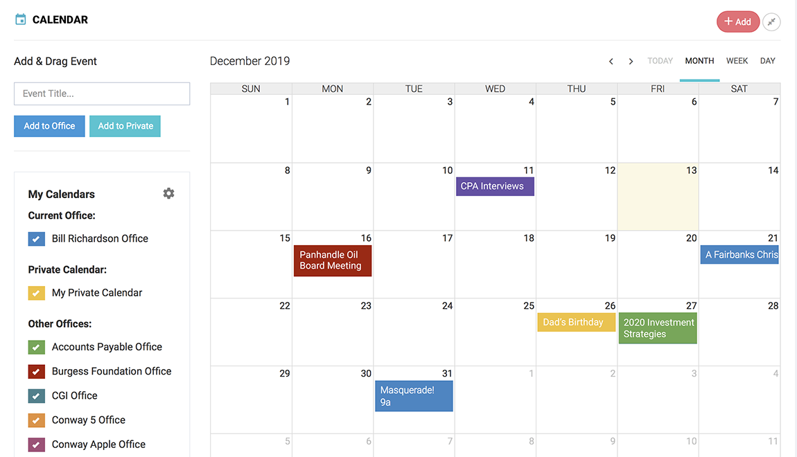 Create color-coded events that only you or selected “virtual office” members can see. Add rich content to make events come alive. Sync inbound, outbound, or bi-directionally with your Google, Outlook, Apple, and other calendars.
